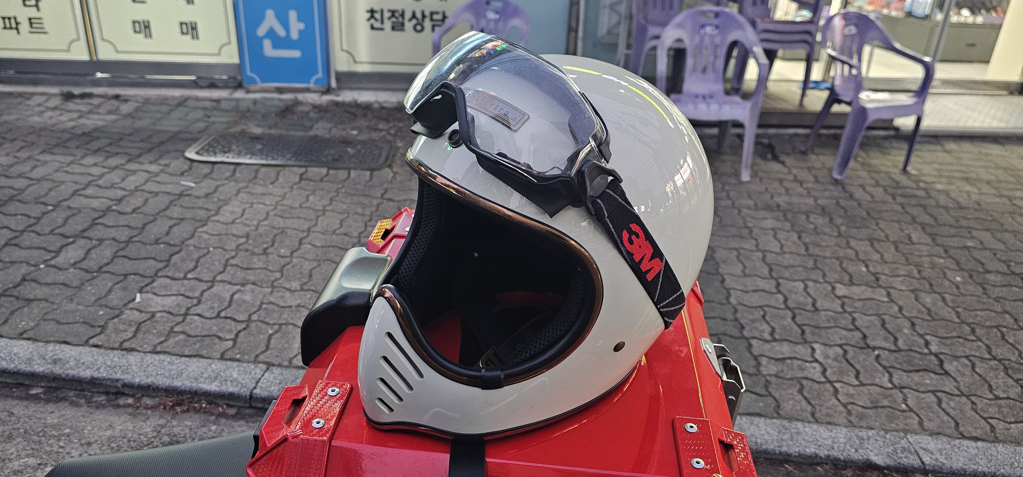 레트로 헬멧이고 난 새부리같이 생긴 저 모양을 극혐했는데 막상 착용해보니 김서림도 덜하고 진짜 편하다.